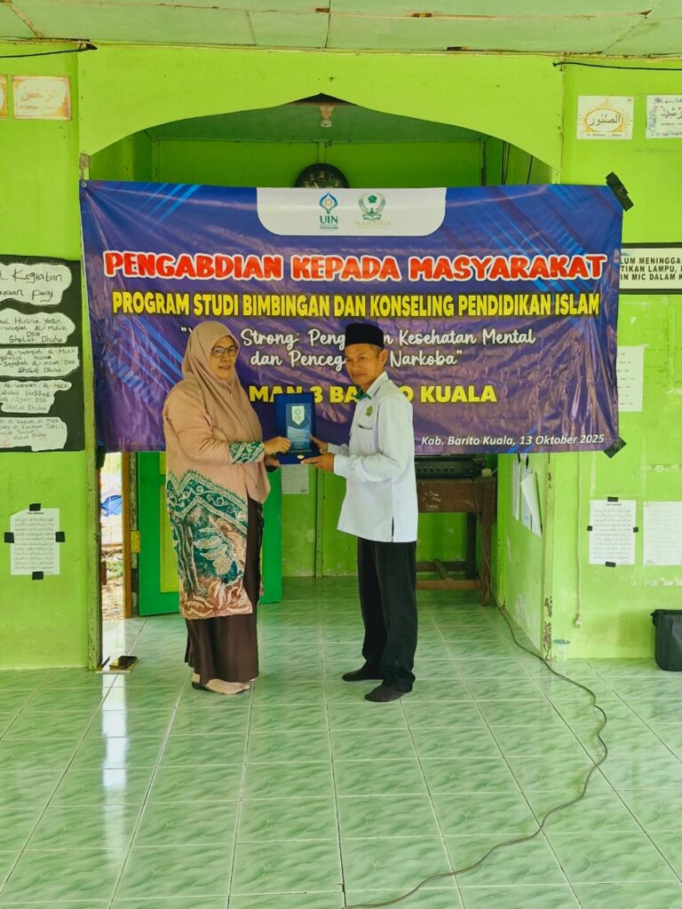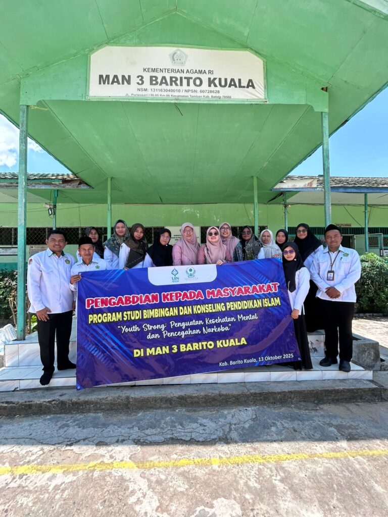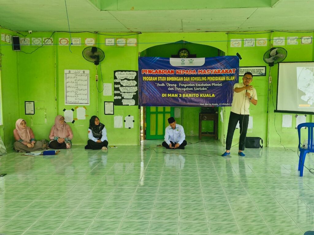 Barito Kuala – Program Studi Bimbingan dan Konseling Pendidikan Islam (BKPI) Fakultas Tarbiyah dan Keguruan UIN Antasari Banjarmasin melaksanakan kegiatan Pengabdian kepada Masyarakat dengan tema “Youth Strong: Penguatan Kesehatan Mental dan Pencegahan Narkoba di MAN 3 Batola.” Kegiatan yang dilaksanakan pada Senin, 13 Oktober 2025 di MAN 3 Barito Kuala (Batola) ini menjadi wujud nyata implementasi Tri Dharma Perguruan Tinggi dalam bidang pengabdian kepada masyarakat.